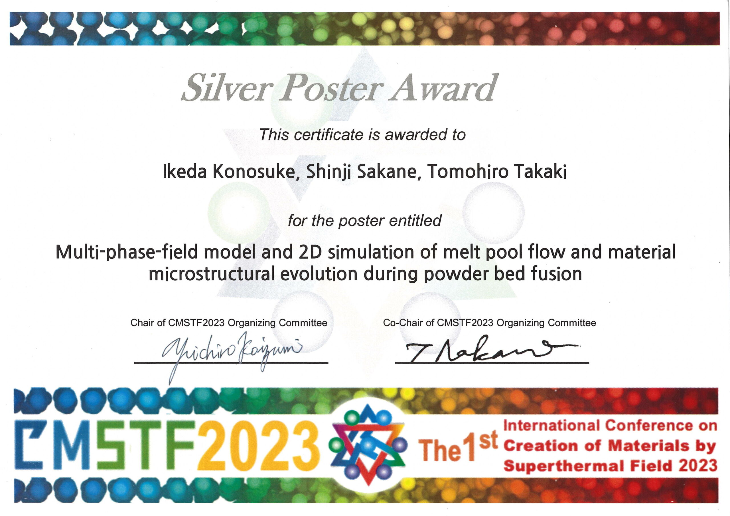 ・The 1st International conference on Creation of Materials by Superthermal Field 2023 Silver Poster Award (honorable certificate)