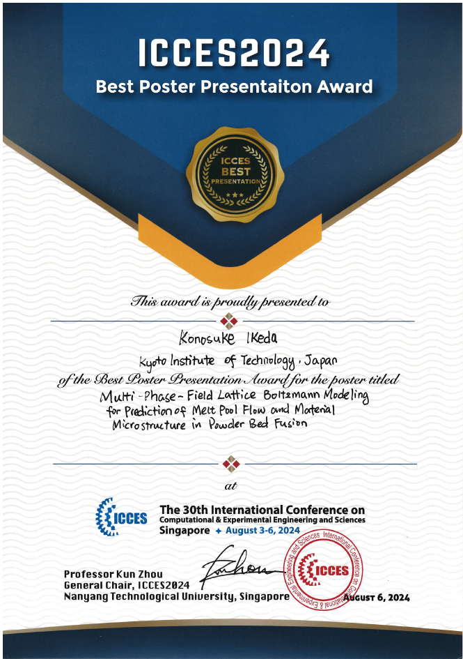 ・The 30th International Conference on Computational & Experimental Engineering and Sciences Best Poster Presentation Award (honorable certificate)